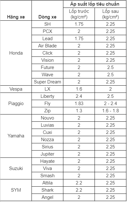 Như đã nói ở trên, mỗi một loại lốp sẽ một một mức áp suất lốp tiêu chuẩn khác nhau. Vậy bơm lốp xe máy bao nhiêu là đủ? Bảng áp suất lốp tiêu chuẩn dưới đây sẽ giúp bạn trả lời câu hỏi.