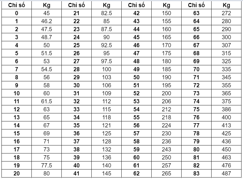 Trước tiên, số 38 chính là chỉ số chịu tải. Tức là tải trọng tối đa mà lốp xe máy đó chịu được. Nhưng bạn đừng hiểu nhầm là xe chịu tải được 38kg. Số 38 chỉ là một chỉ số, mà ứng với nó sẽ có số kg chịu tải tương ứng. Điều này bạn có thể thực hiện thông qua bảng bên dưới.
