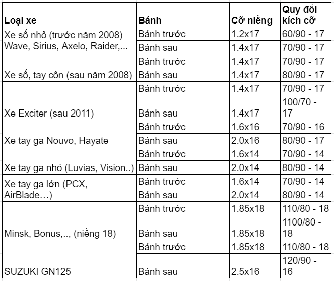 Bảng quy đổi kích cỡ lốp dưới đây chủ yếu được dựa trên kinh nghiệm của những người hiểu biết về thông số lốp xe máy. Do đó, cách quy đổi này không phải là quy chuẩn hoàn toàn đúng.