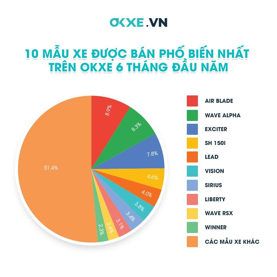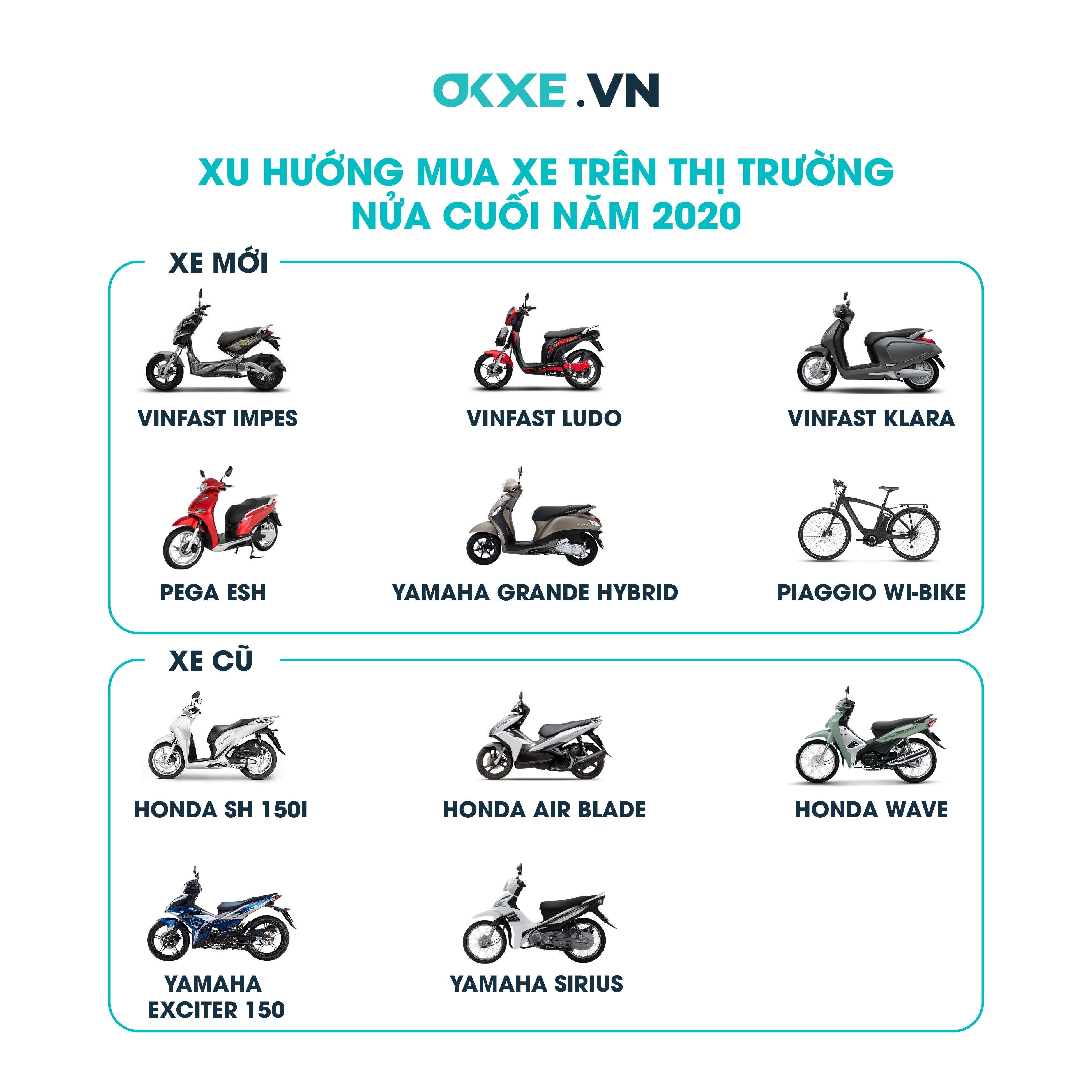 Về mảng xe cũ, các mẫu xe vẫn sẽ lọt top doanh số bán ra của OKXE bao gồm: Honda SH 150i, Honda Air Blade, Honda Wave, Yamaha Exciter 150 và Yamaha Sirius.