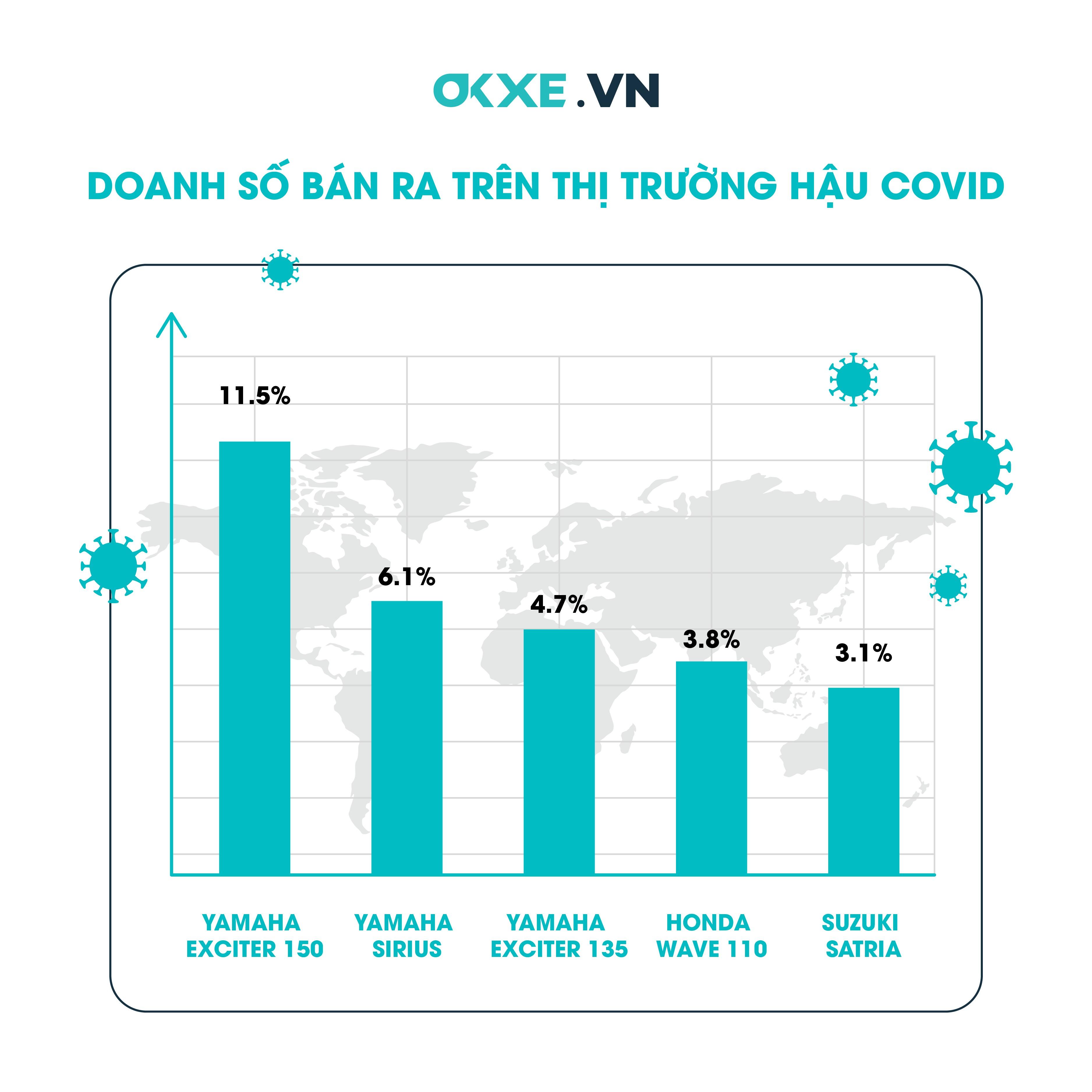 Theo đánh giá của OKXE, Covid-19 sẽ khiến thị trường xe máy tại Việt Nam mất đi cơ hội hồi phục sau những sụt giảm vào năm 2019. Không những vậy, tổng doanh số bán hàng có thể đạt mức thấp nhất trong 5 năm trở lại đây. Trang Motorcycles Data dự đoán tổng doanh số bán ra tại Việt Nam có thể giảm tới 6.2% so với năm 2019, khoảng 2.65 triệu xe.