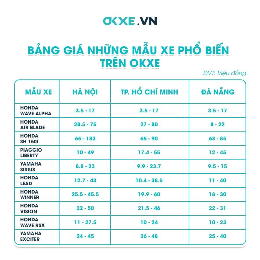 Bảng giá những mẫu xe phổ biến trên OKXE cụ thể như sau: