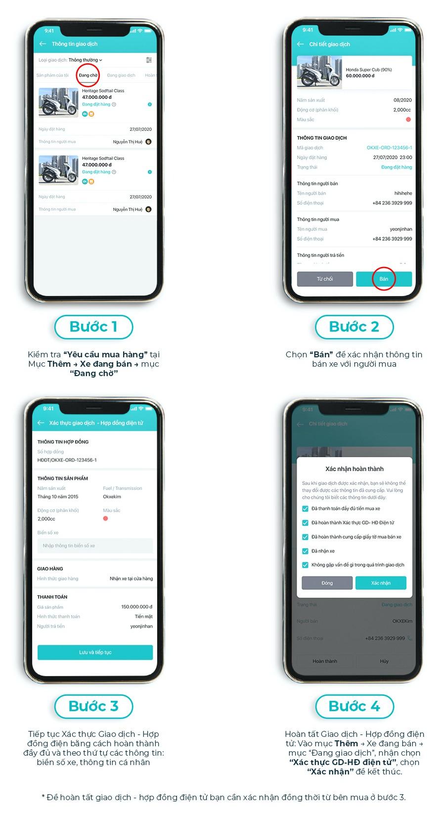 - Thực hiện tạo và hoàn thành “Xác thực Giao dịch – Hợp đồng điện tử” đối với mỗi giao dịch mua bán xe máy trên website và ứng dụng OKXE.