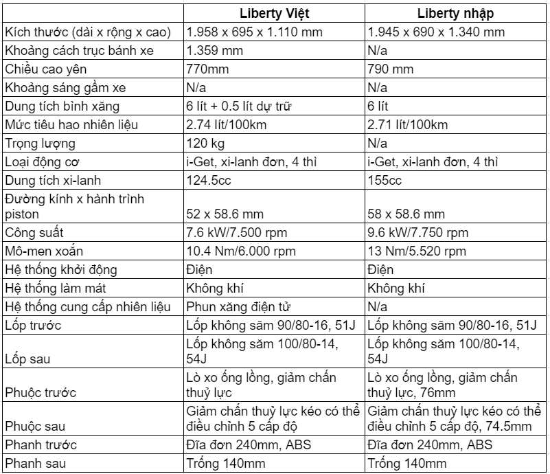 Thân xe của Liberty Việt đã được thiết kế lại với phần yên xe dài hơn. Giúp chở được nhiều người hơn và người ngồi cũng cảm thấy thoải mái hơn. Chiều cao yên của Liberty Việt cũng thấp hơn phiên bản nhập khẩu 25mm là 770mm. Tuy nhiên, bản nhập lại thu hút người tiêu dùng nhiều hơn so với bản Việt vì bản nhập thiết kế thân xe thanh thoát, trẻ trung hợp với cả nam và nữ. Tư thế ngồi lái của cả hai chiếc xe đều được nghiên cứu lưỡng để tạo trải nghiệm lái độc nhất vô nhị.