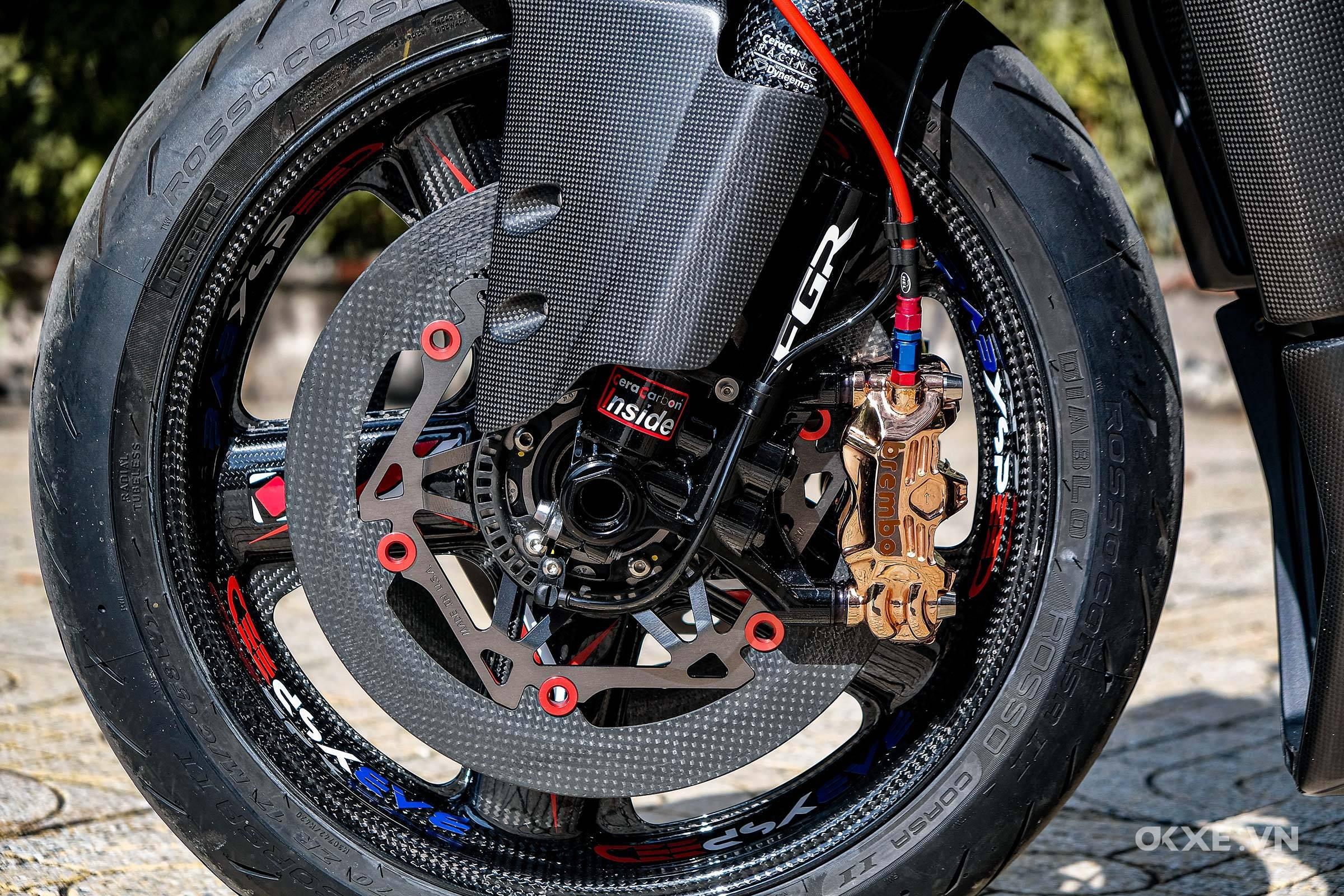 Hệ thống phanh trước gồm kẹp phanh Brembo MotoGP Monobloc màu vàng đi kèm đĩa Braketech CMC bằng carbon. Combo phanh trước có giá hơn 12.000 USD. Ở phía sau, xe được trang bị giảm xóc Ohlins TTX đi kèm kẹp phanh Brembo HRC, đĩa TK Racing. Bộ mâm Marchesini nguyên bản được thay bằng mâm carbon của Rotobox.